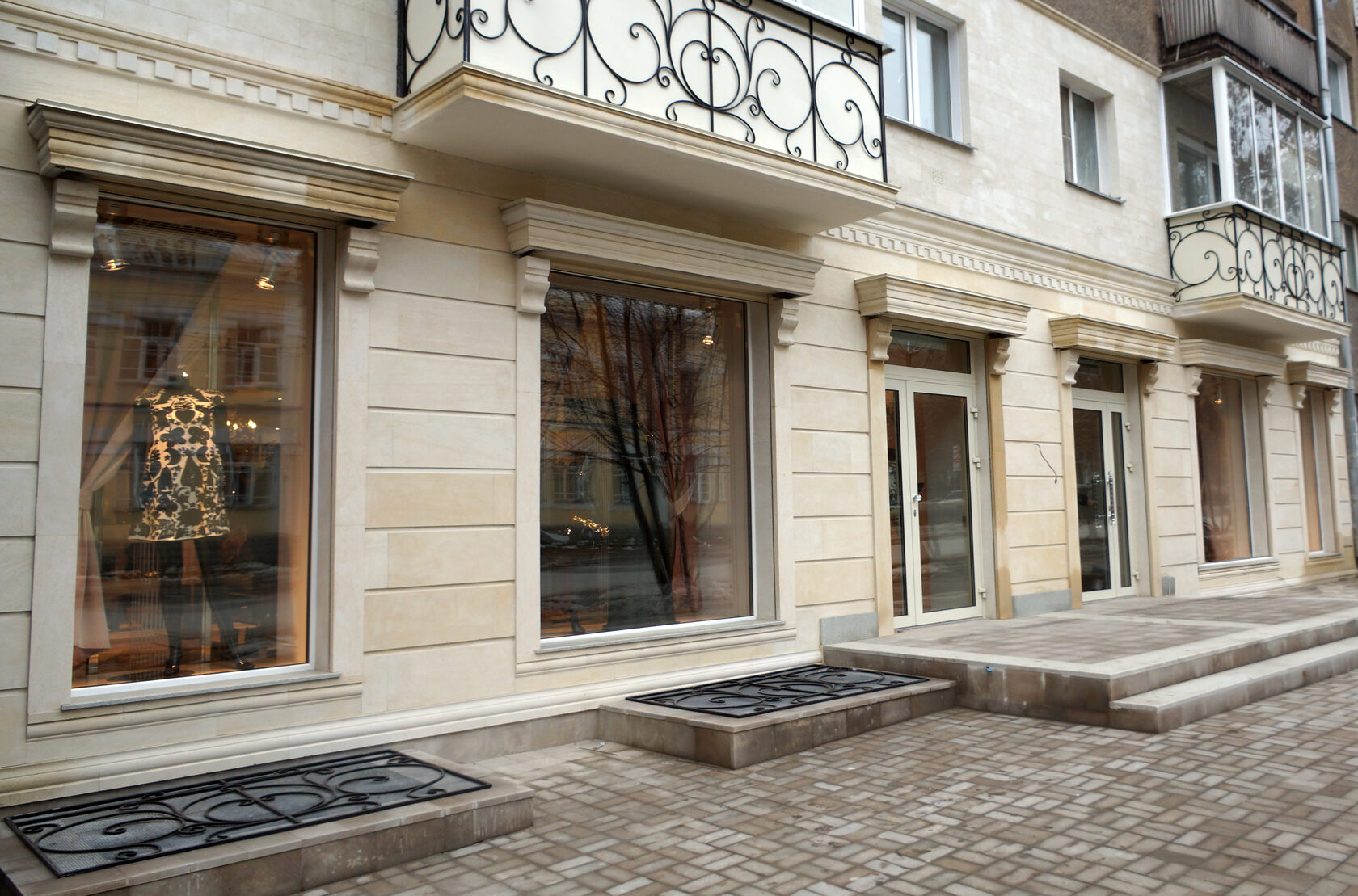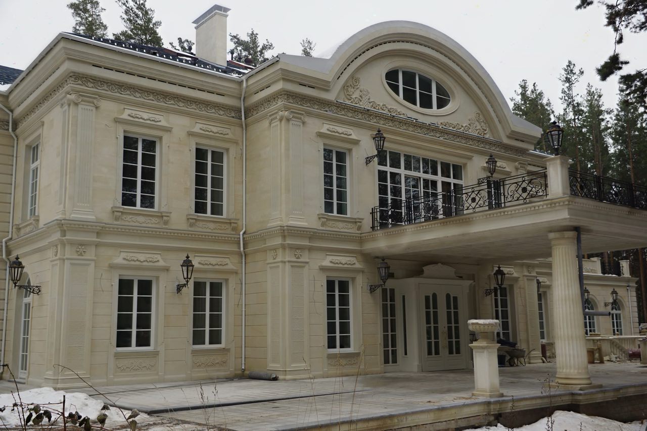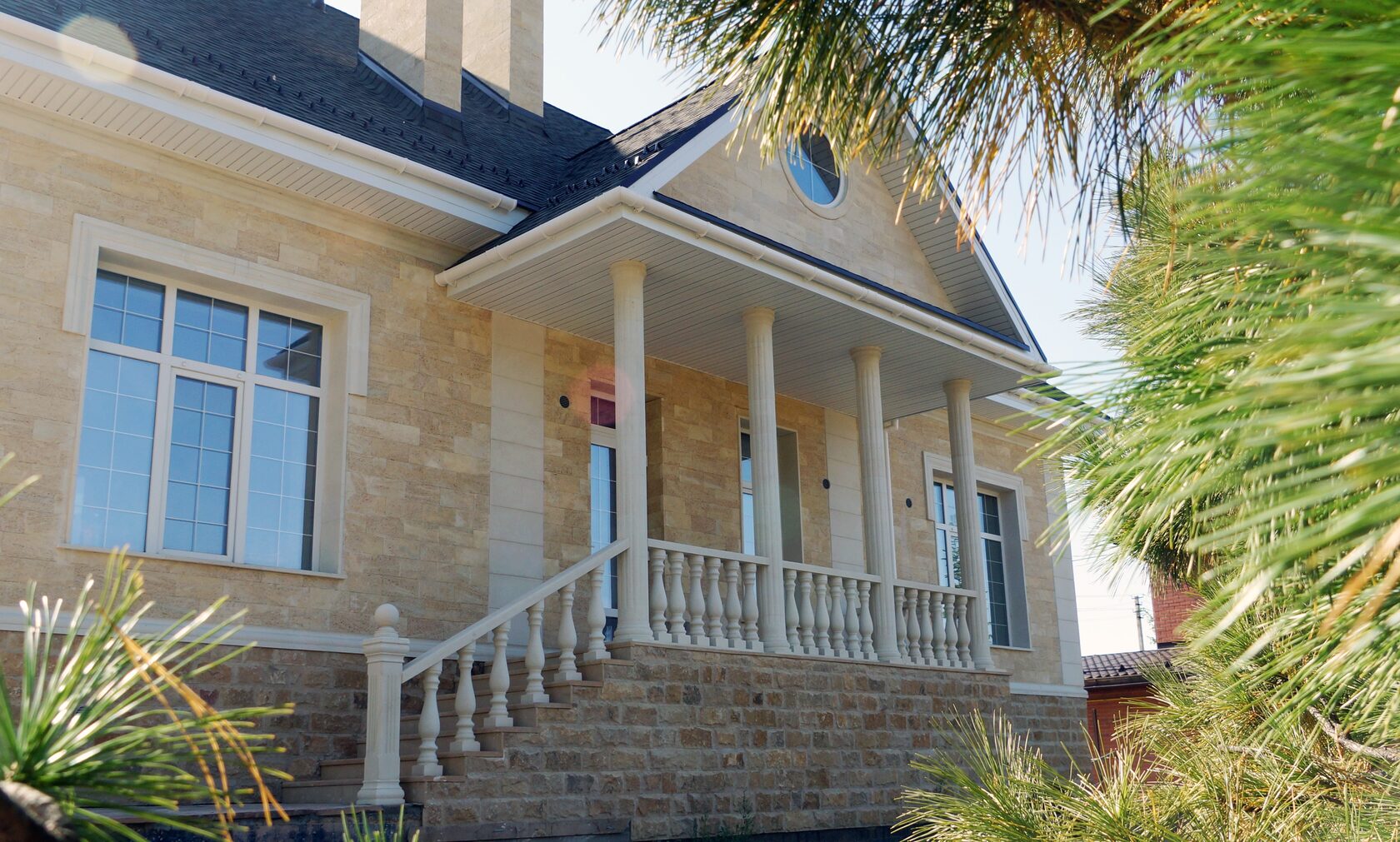 Облицовка фасада плитами из дагестанского ракушечника. Архитерктурные элементы (наличники, кронштейны) изготовлены из дагестанского известняка.