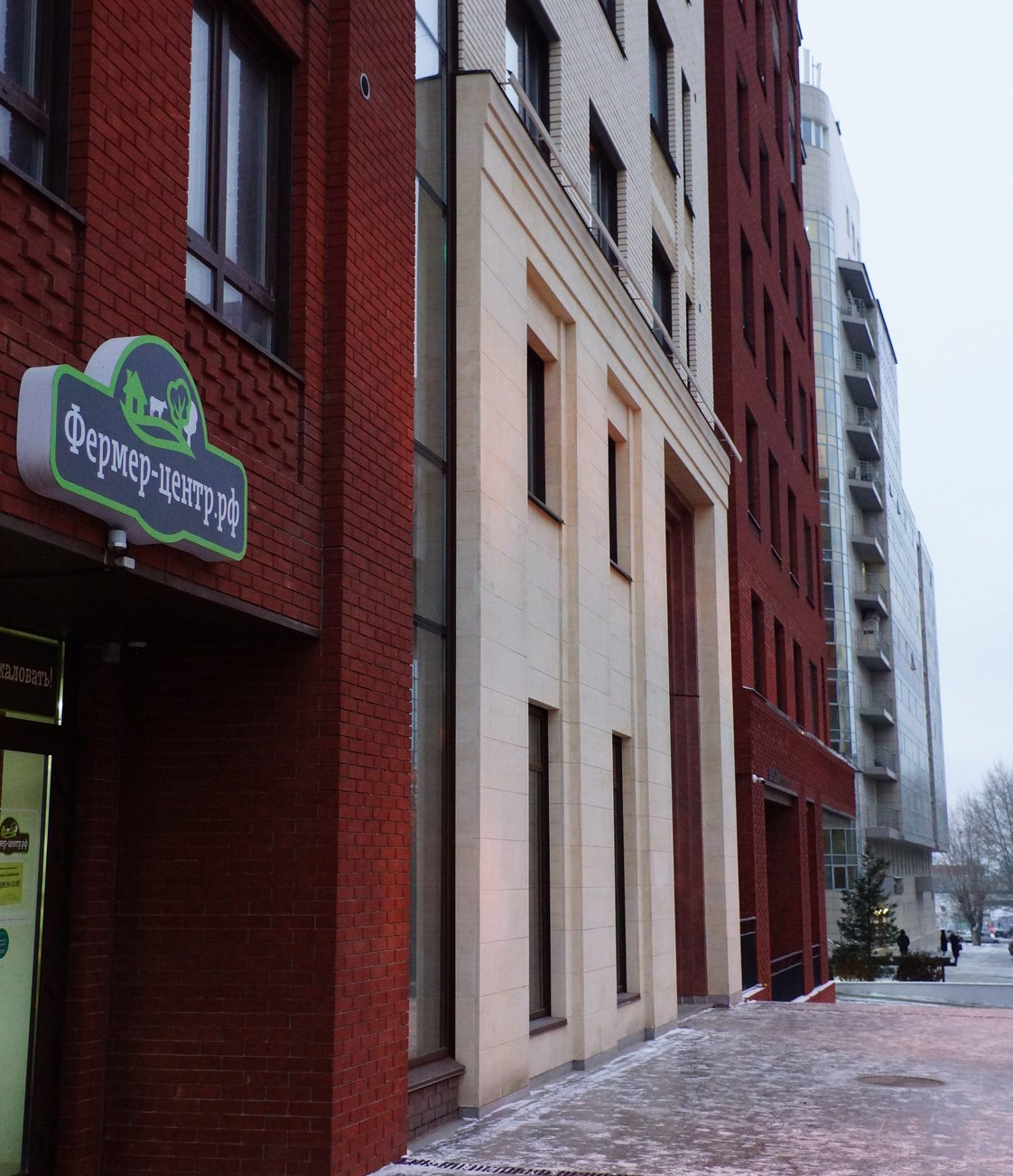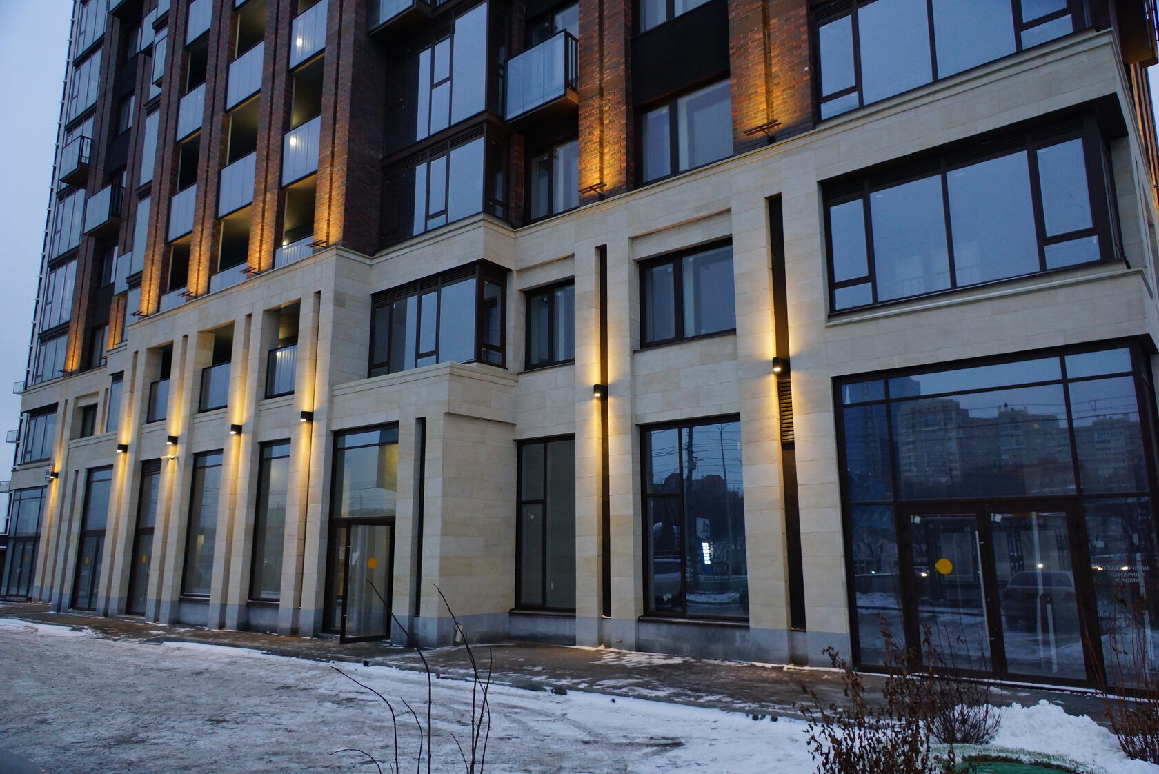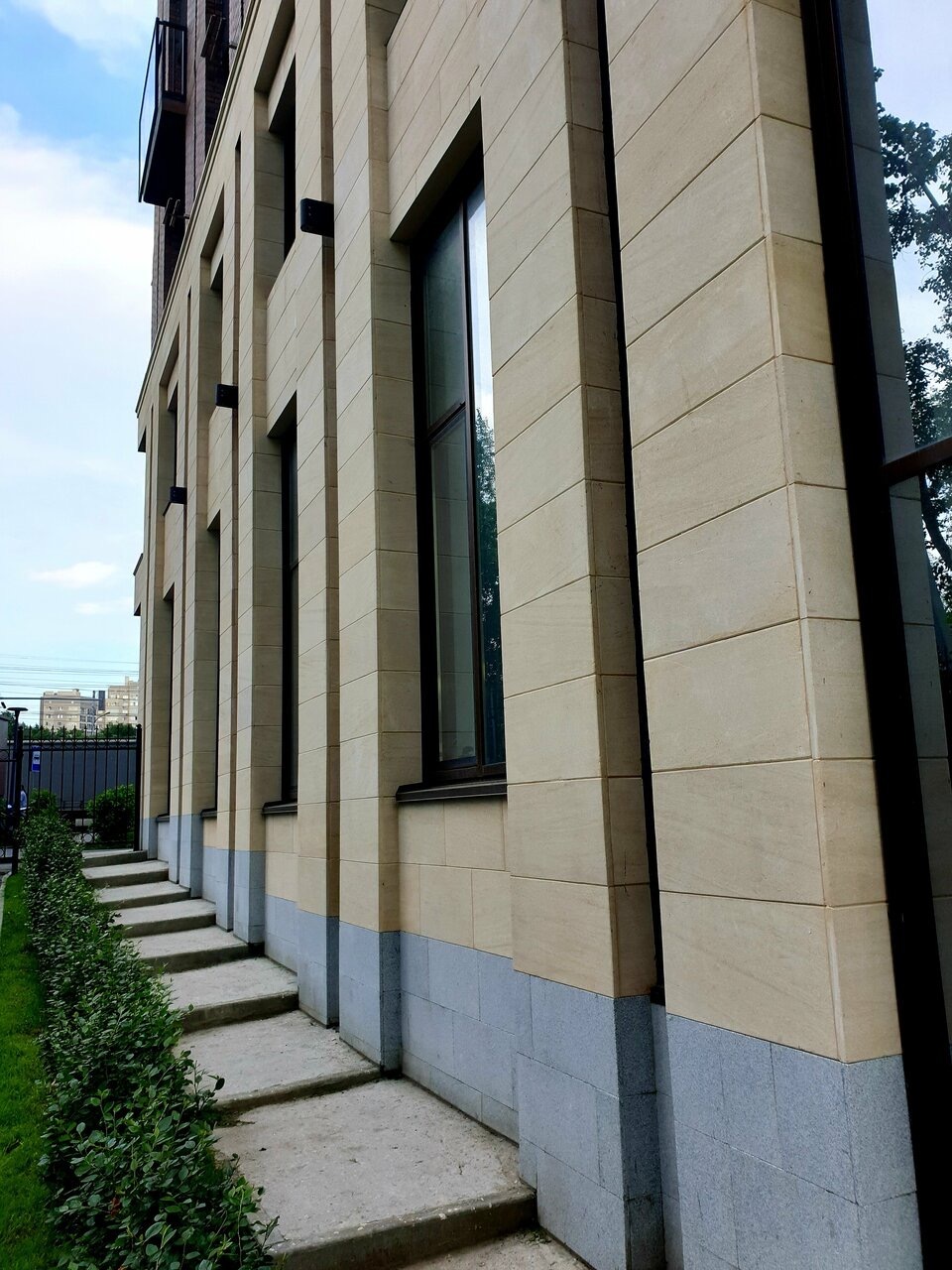 Облицовка первых 2-х этажей входной группы выполнена плитами из дагестанского известняка АК клеевым способом.