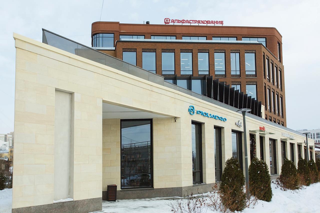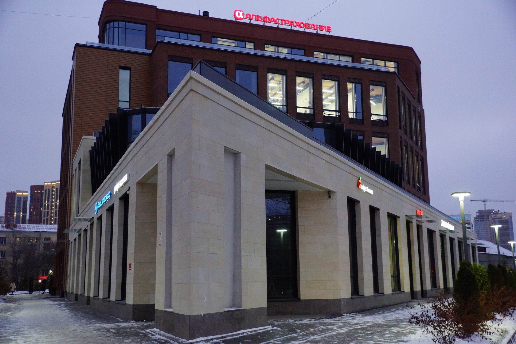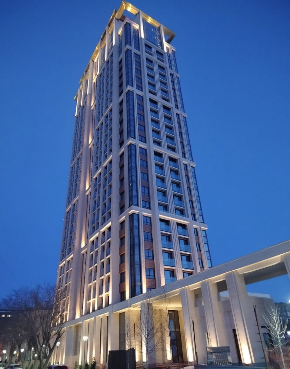 Облицовка первых 2-х этажей входной группы выполнена плитами из дагестанского известняка АК клеевым способом.