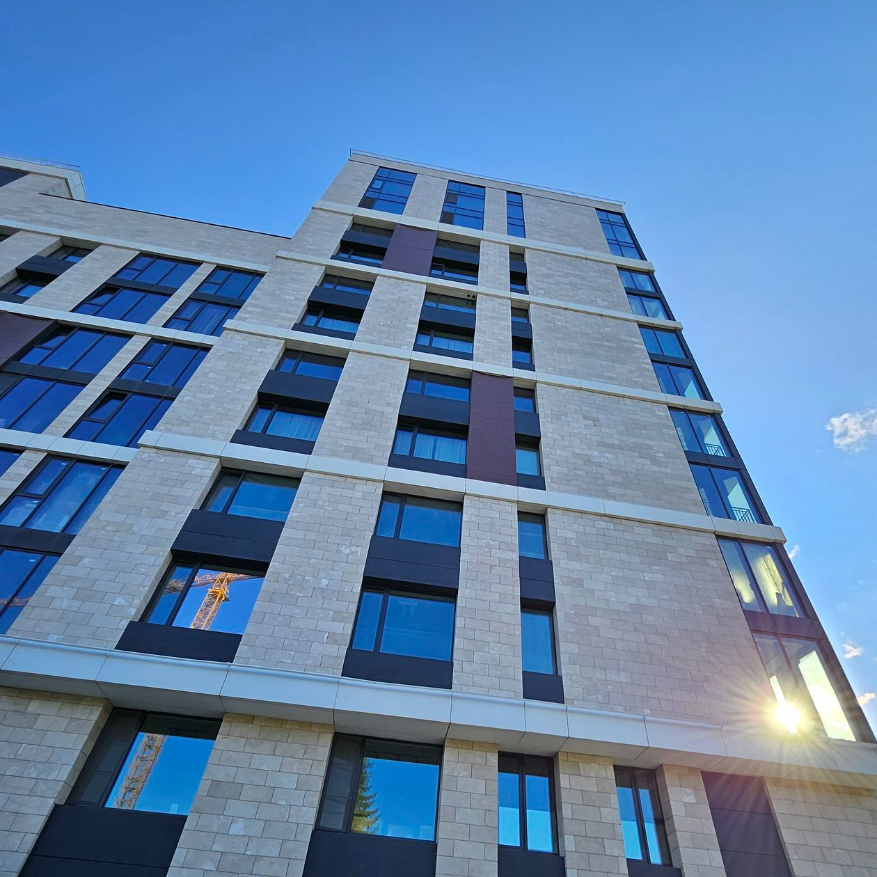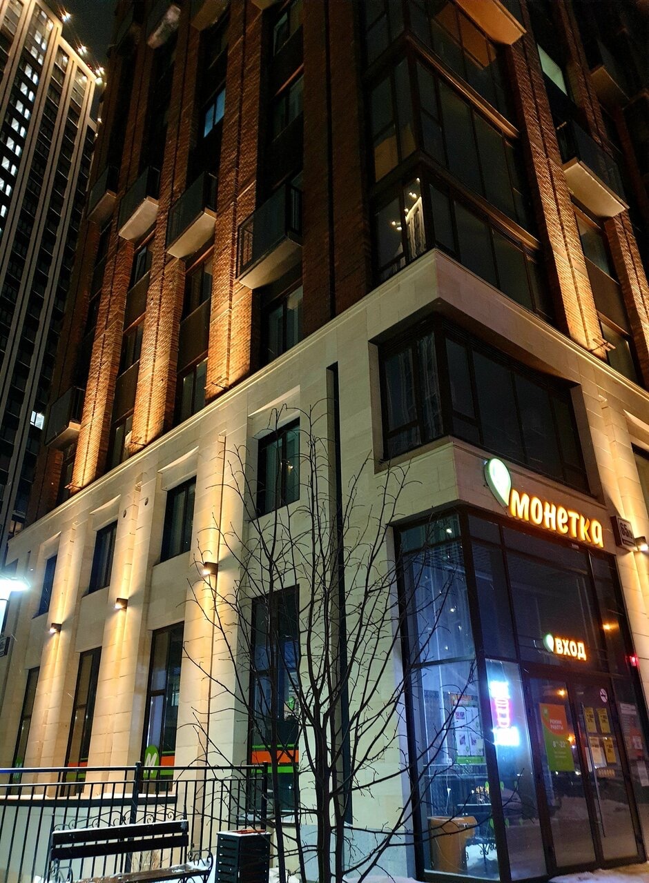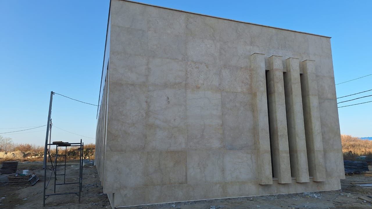 Облицовка выполнена методом НВФ крупноформатными плитами из дагестанского мрамора в оттенке Сrema (формат — 1200х1800х30мм).