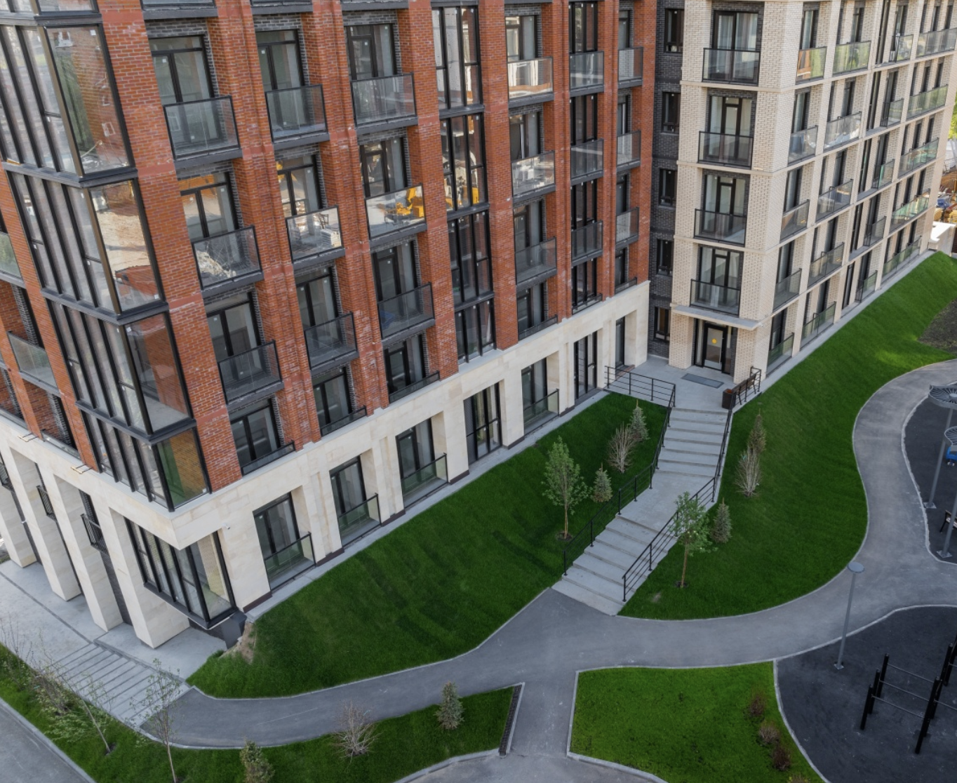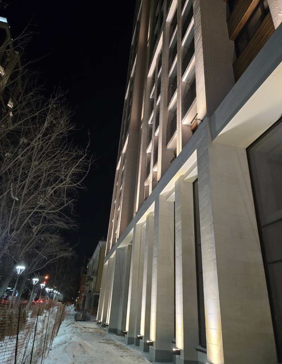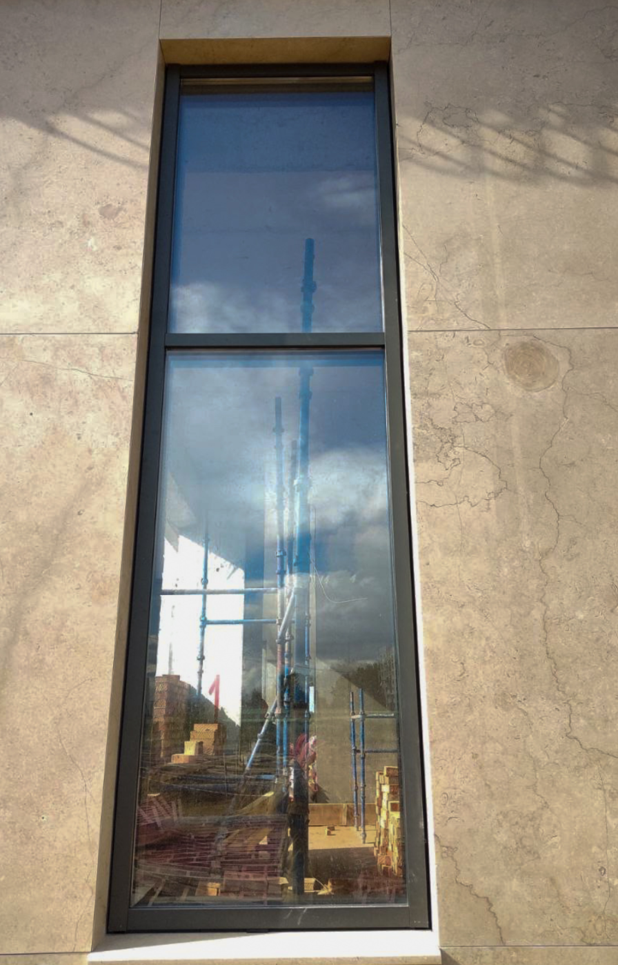 Облицовка выполнена методом НВФ крупноформатными плитами из дагестанского мрамора в оттенке Сrema (формат — 1200х1800х30мм).