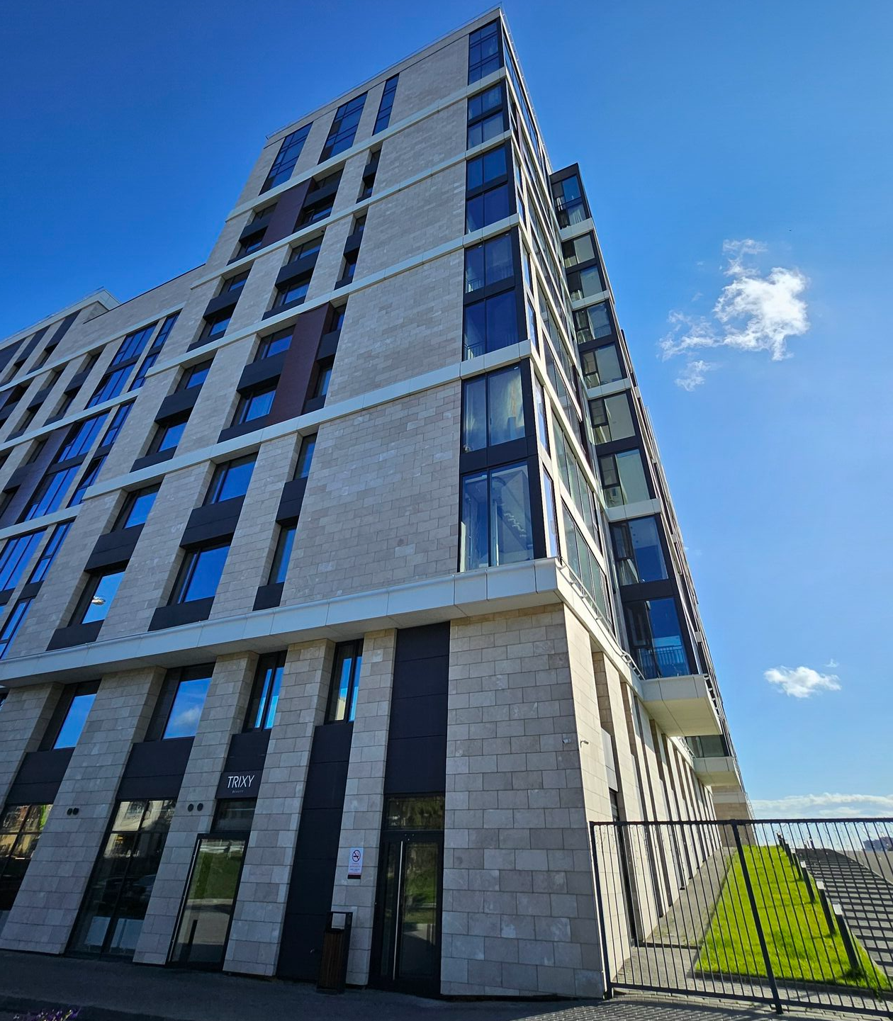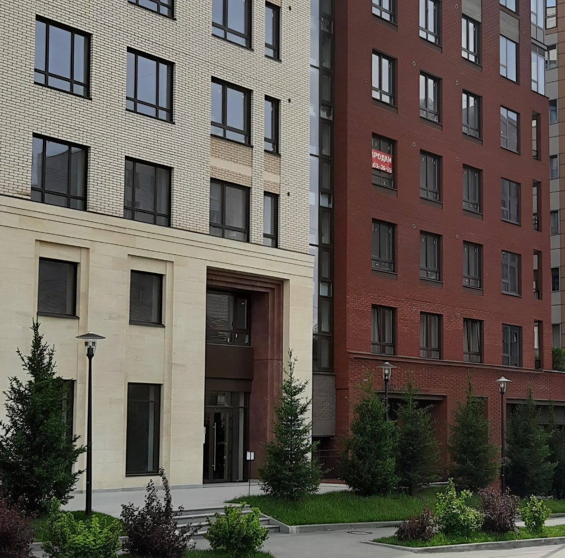 Облицовка первых 2-х этажей выполнена плитами из дагестанского известняка АК клеевым способом.