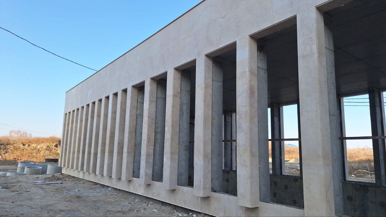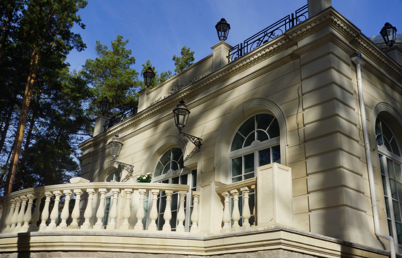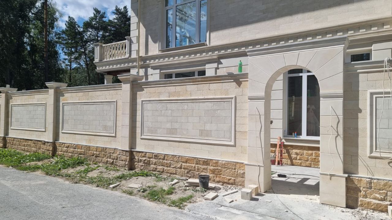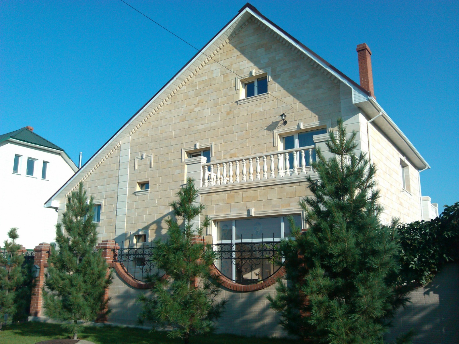 Облицовка фасада выполнена плитами из дагестанского известняка АК клеевым способом.