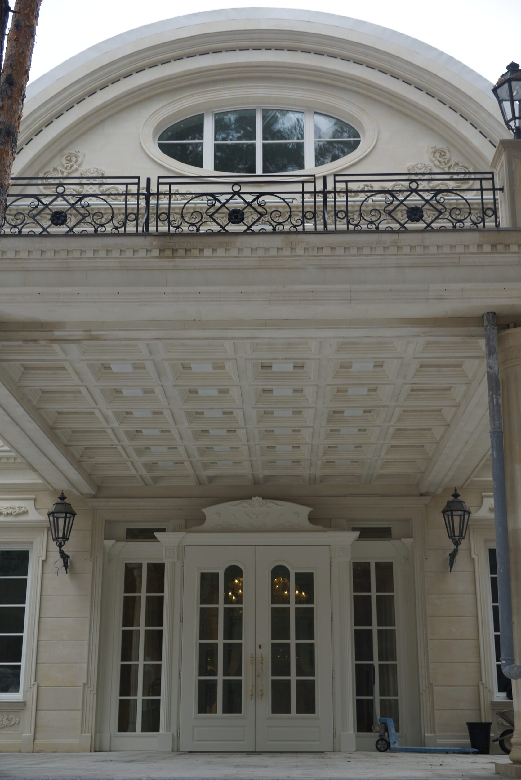 Облицовка частного особняка плитами и архитектурным элементами из дагестанского известняка двух типов. Потолок входной группы облицован плитами и кессонами из дагестанского известняка.