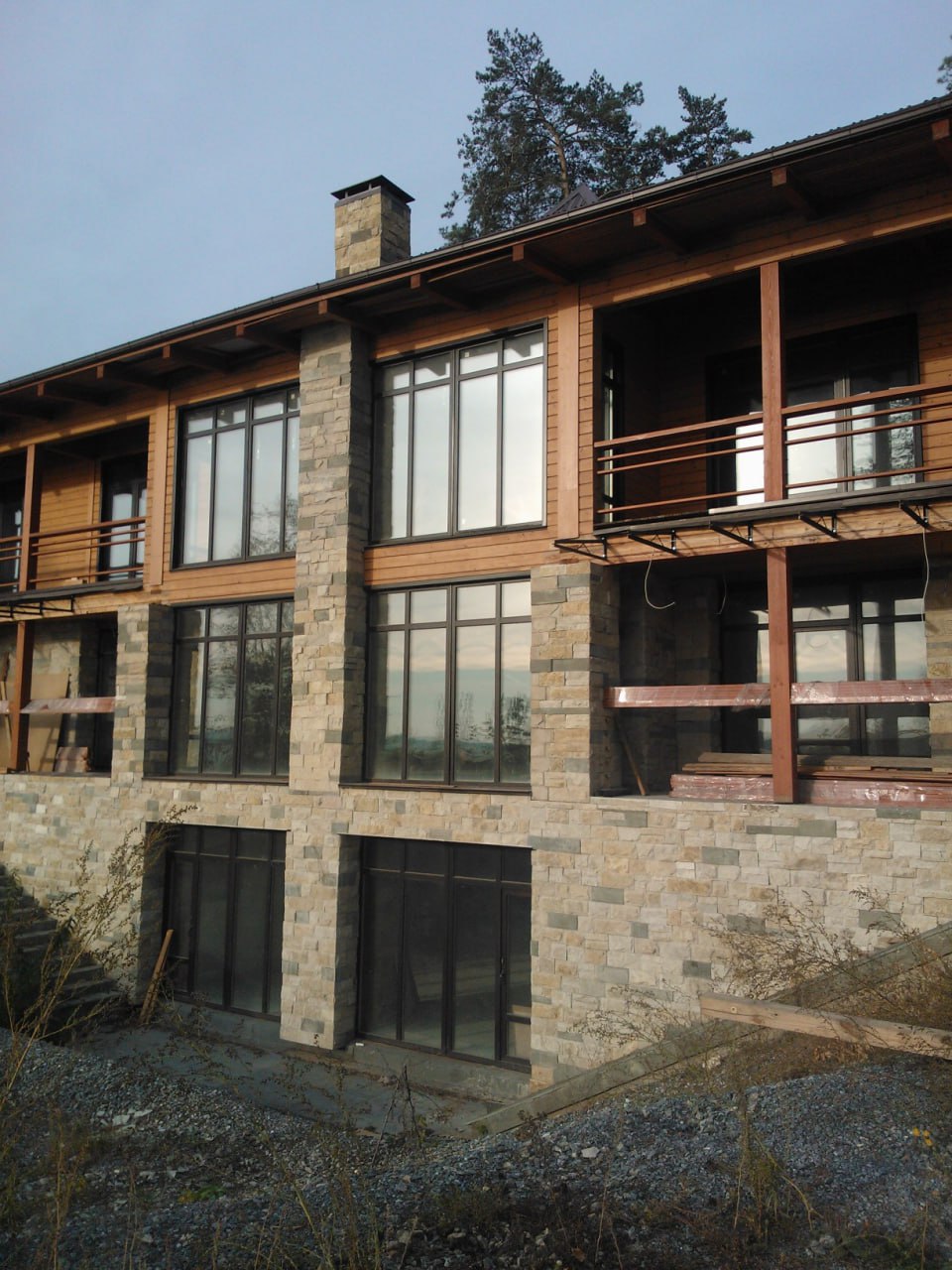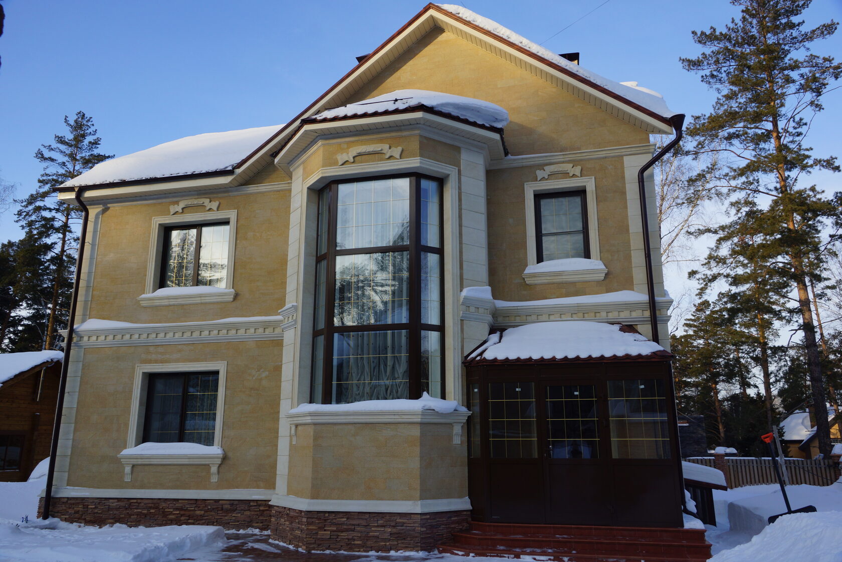 Облицовка фасада коттеджа плитами из дагестанского ракушечника.