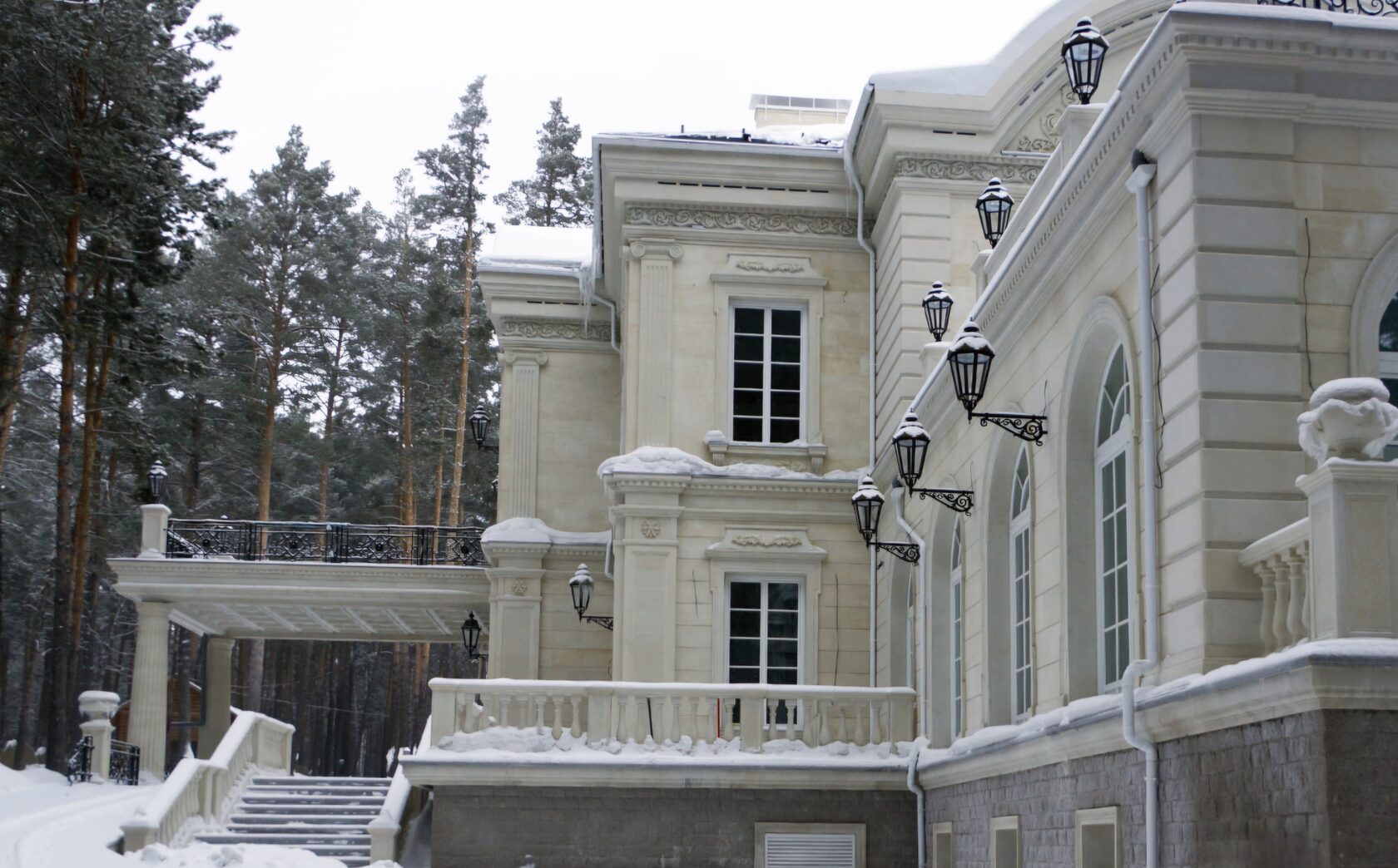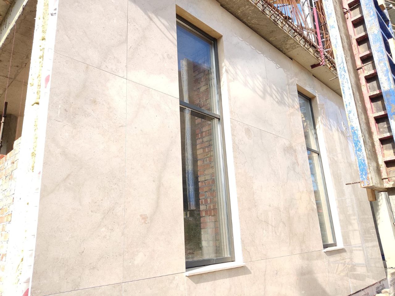 Облицовка фасада выполнена плитами из дагестанского мрамора в оттенке Сrema методом НВФ на планке.